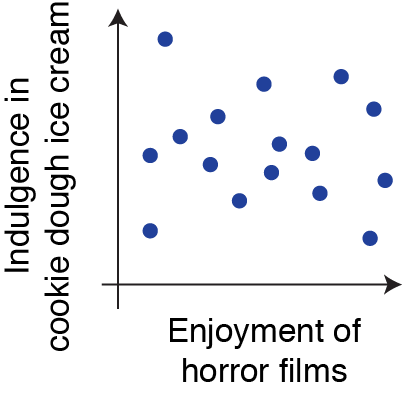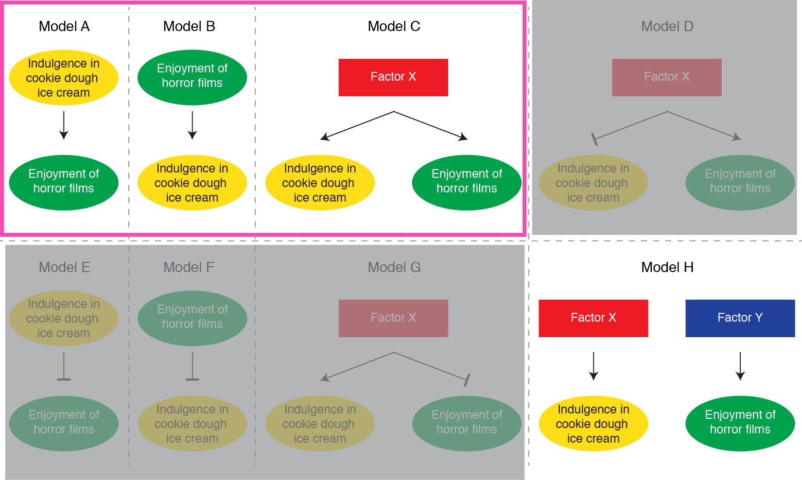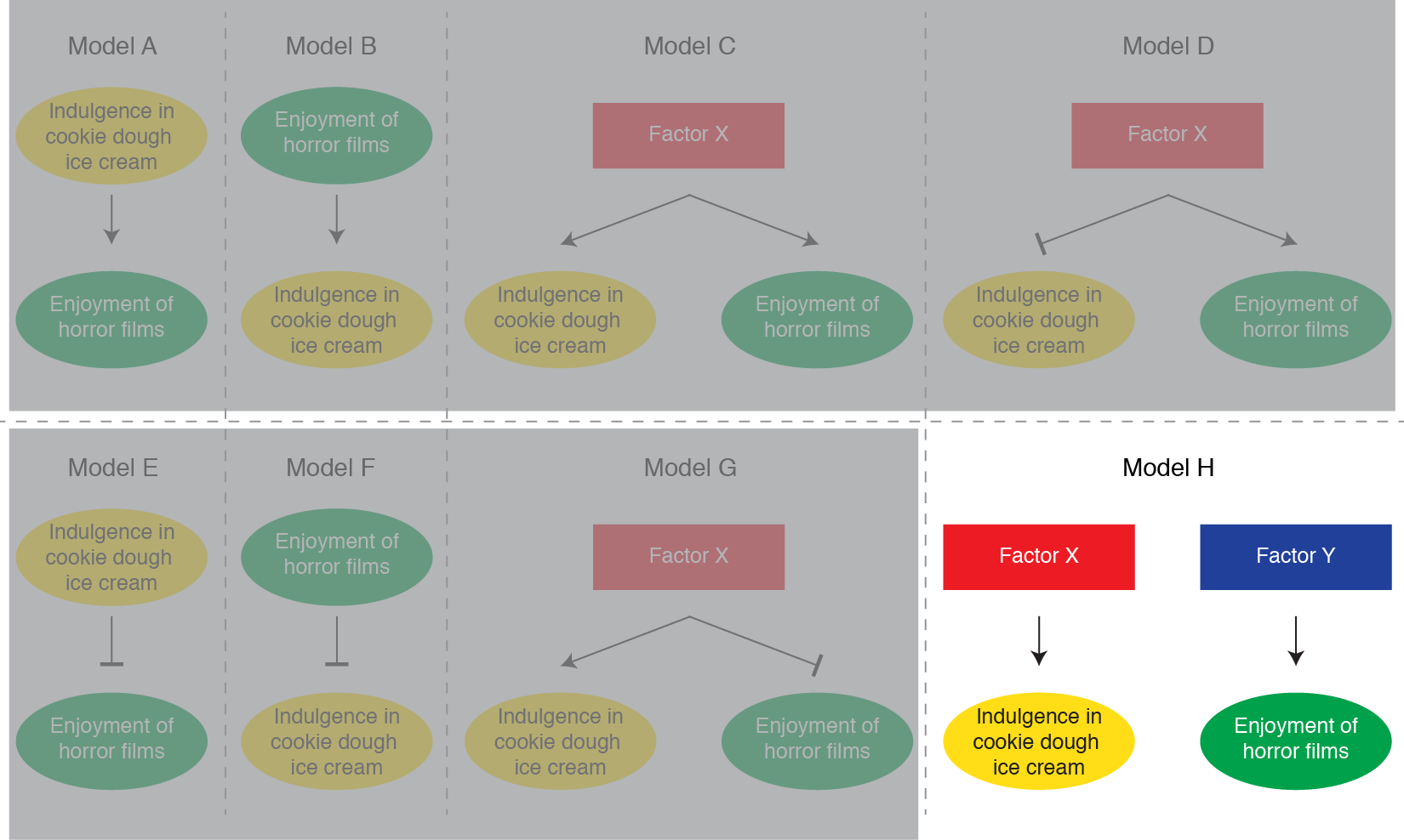 How do we feel about those models now? Well, given the lack of correlation between cookie dough indulgence and horror film enjoyment, it now seems extremely unlikely that these two are causally related. Certainly, if they are, it’s not going to be anything so straightforward as Model A–G. And definitely, the data strongly suggest that these two characteristics are wholly unrelated—in other words, Model H.