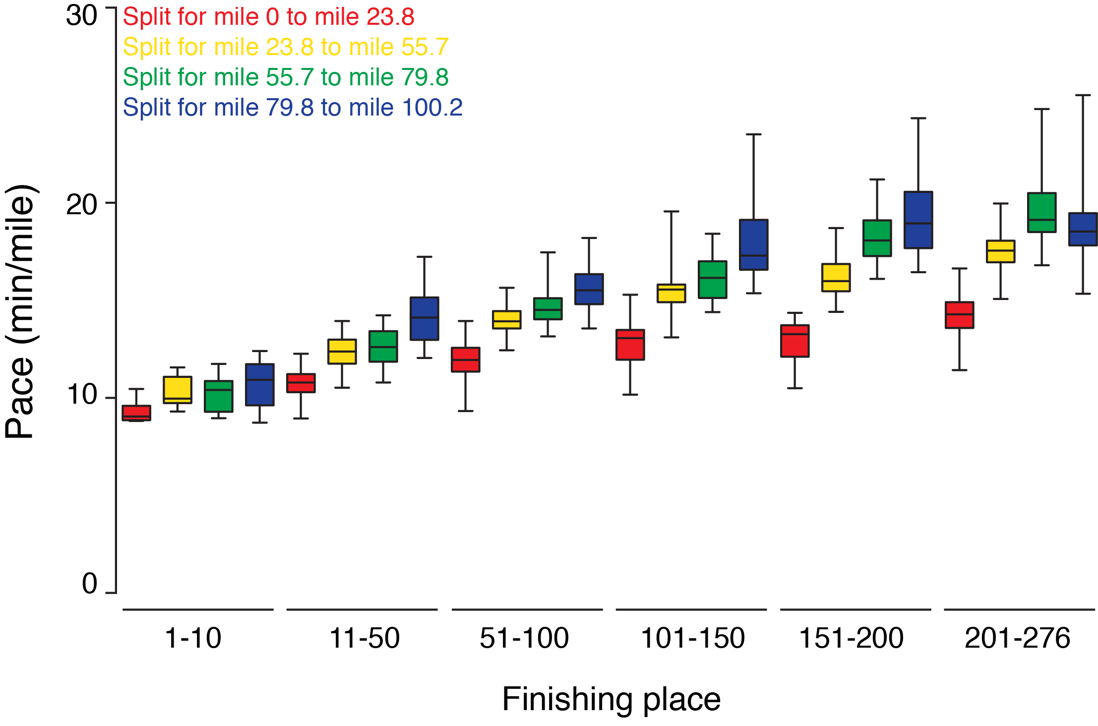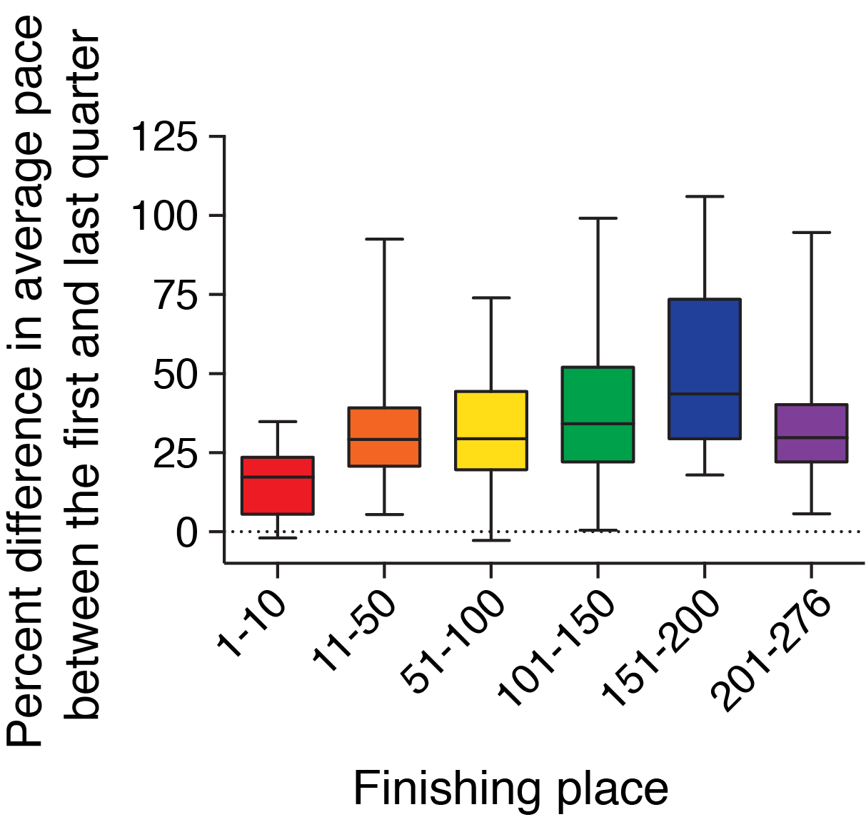 It’s hard for me to look at this plot and not think that pretty much every single runner (with the exception of the top 10, maybe 20) is going out too hard. I mean, way too hard. For instance, take the 151-200 group: the slowest pace in the first quarter for this group was faster than the quickest pace in the second quarter of the race. The median first quarter pace for those runners (13.3 min/mile) was closer to what the elites were doing at the start (9.1 min/mile) than what those same mid-packers did at the end of the race (19 min/mile).[2][3]