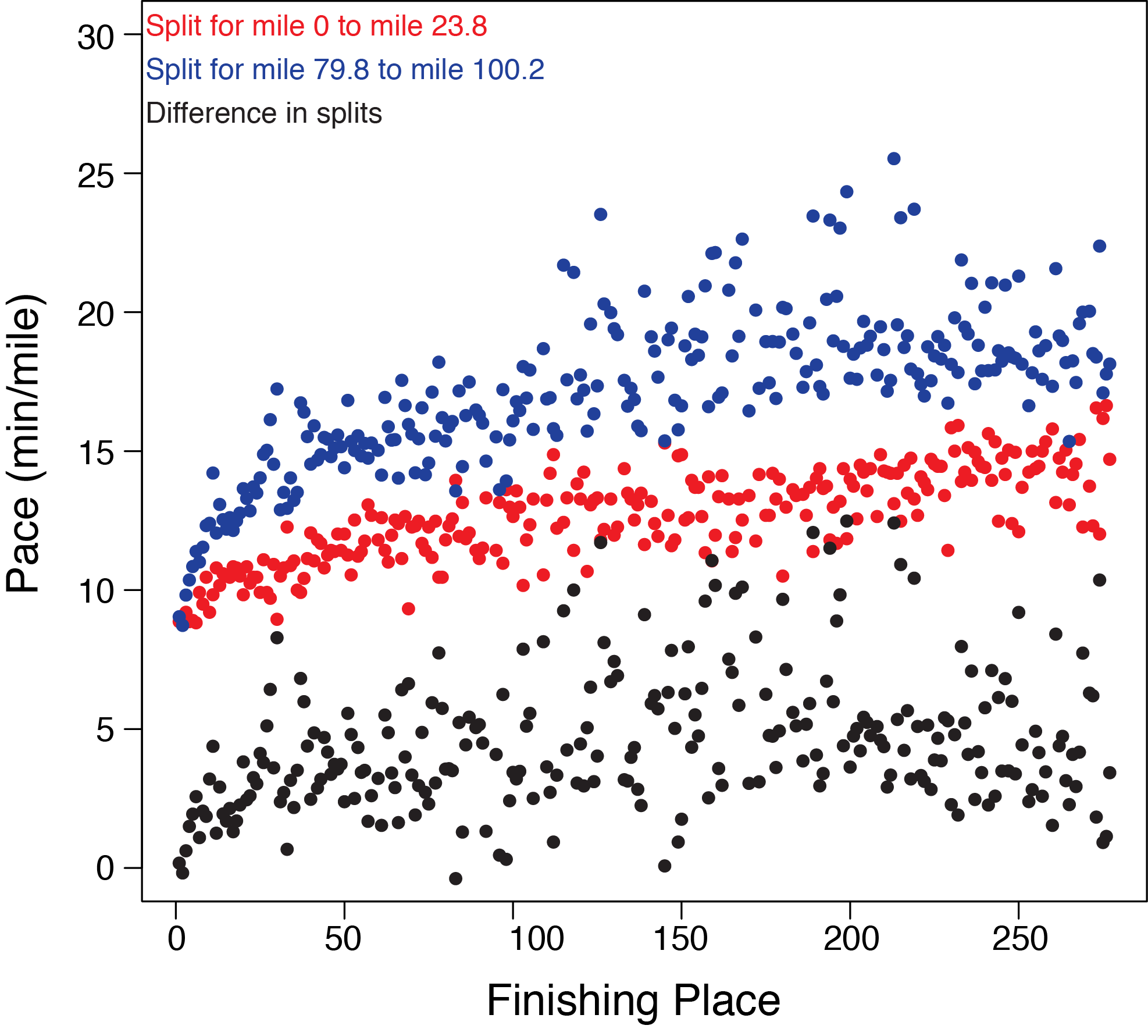 As an ultrarunner, I’ve got to say that this is a rough graph. People are going minutes per mile slower at the end of the race. And there are several runners whose difference in speeds is larger than the speed they had in the first quarter. Yeah, “hemorrhaging time” sounds about right.